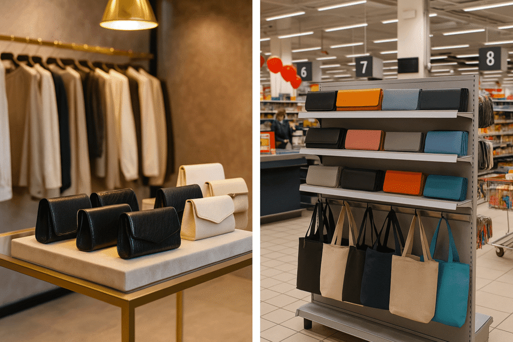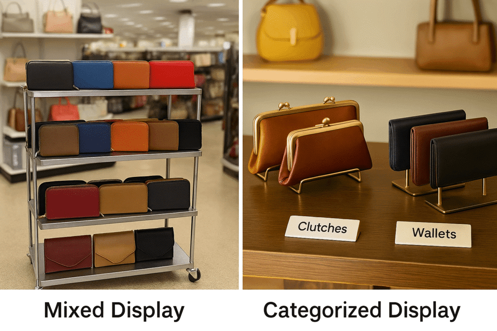 Shoppers make decisions based on how products are positioned in space. Visual hierarchy, lighting, height, and spacing all influence perception—especially in categories like handbags and wallets.
