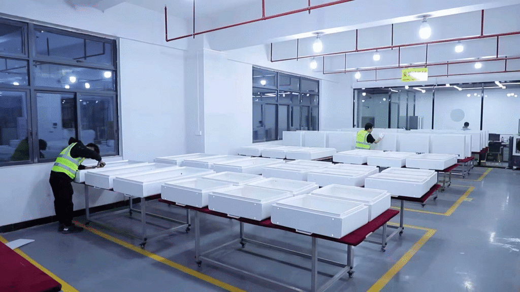 Assemble metal frames, acrylic shelves, wooden bases, and cardboard panels according to drawings and QC standards.