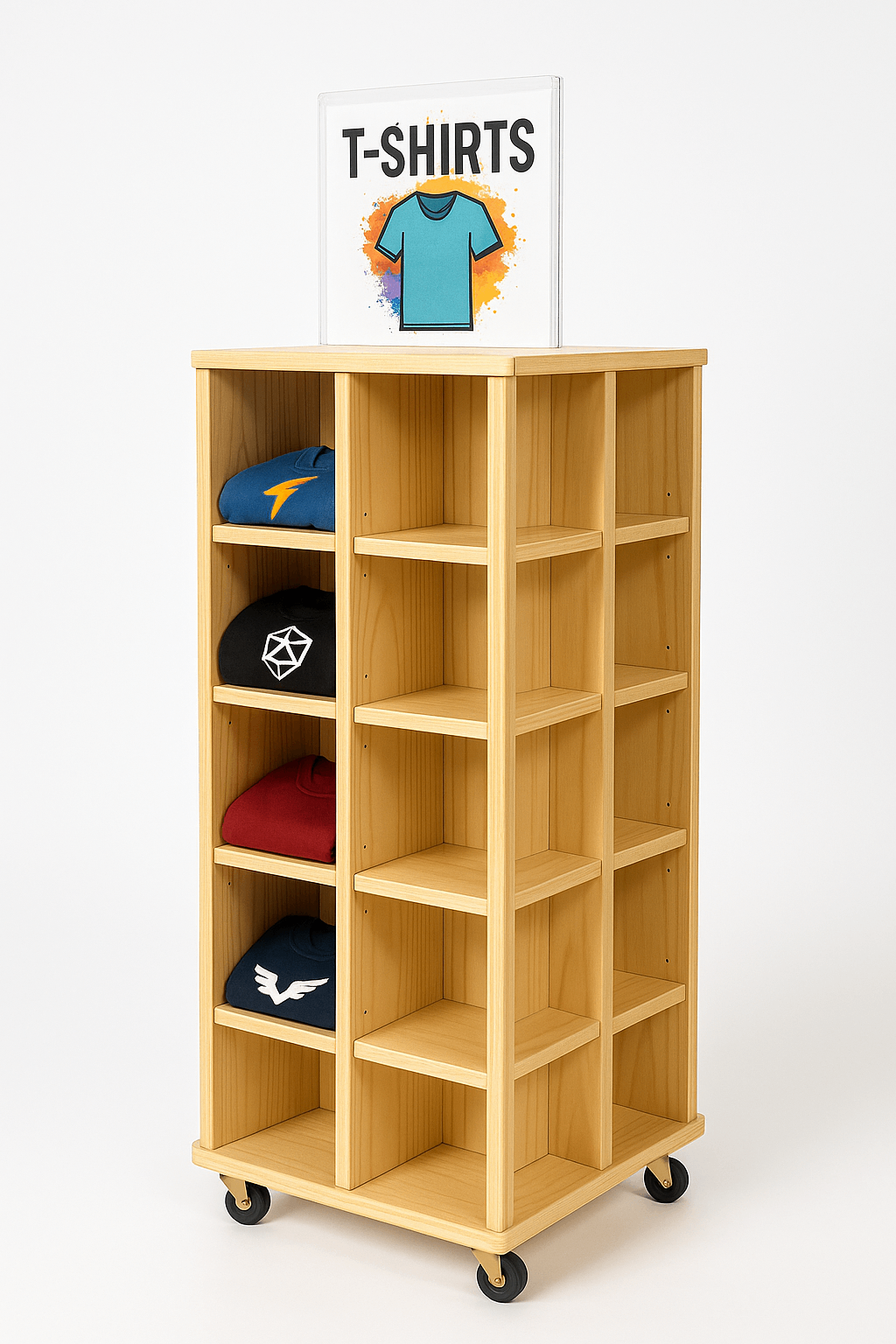 Built for merchandising teams and optimized for cross-border rollout, the 2-sided revolving T-shirt display with cubbies simplifies layout planning and execution.
