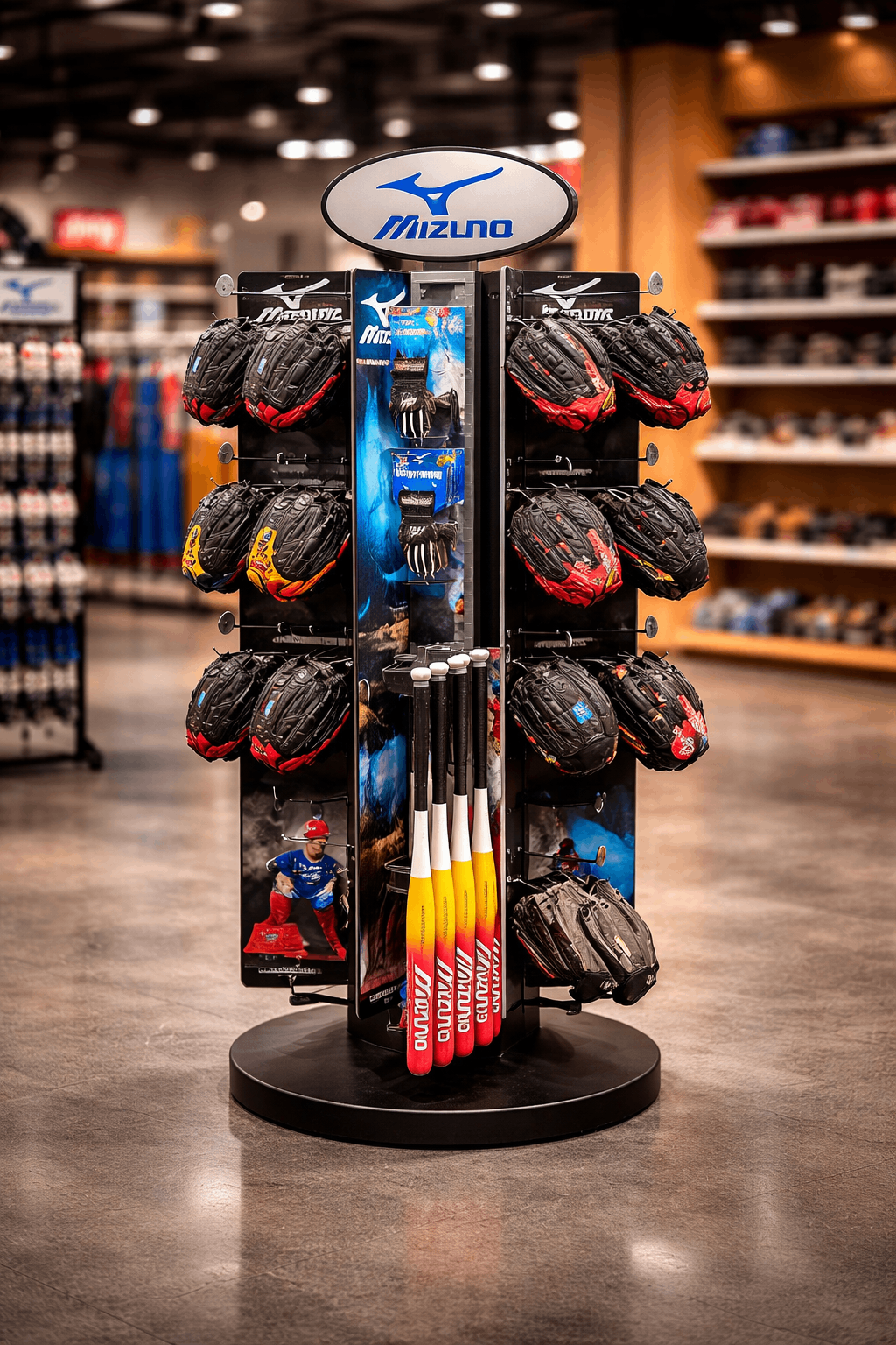 The display primarily supports baseball glove merchandising, but its structure also allows additional retail uses.