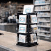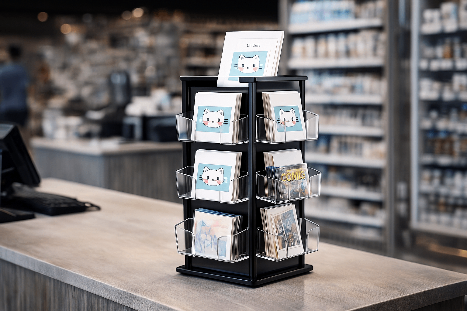 A commercial-grade display system engineered for wholesale buyers requiring stable, consistent, and customizable countertop fixtures for books, greeting postcards, brochures, and mixed printed media.