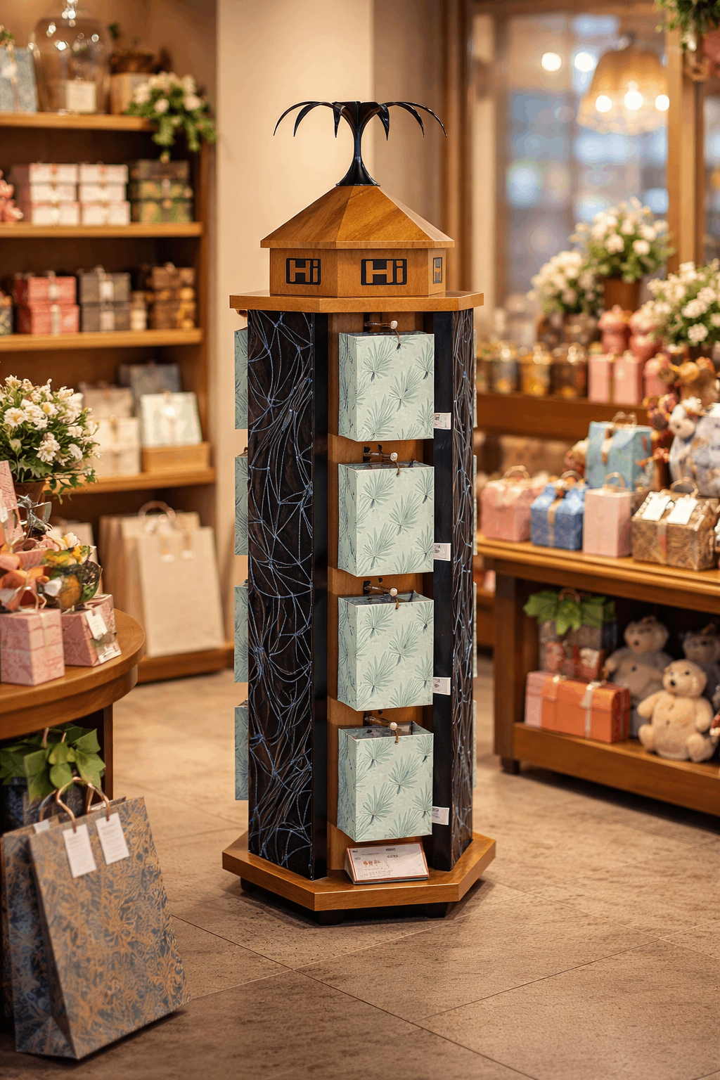 The model features a six-sided rotating metal structure, a hexagonal base footprint, a steel hook hanging system and a wood-top decorative cap suitable for premium retail interiors. Therefore, it functions well as a gift bag display rack, golf shop bag display, coffee bag display or light handbag display rack in golf pro shops, stationery chains, bookstores, duty-free stores and lifestyle retailers. As a result, suppliers and retailers can formalize bag packaging as a managed category instead of an informal bin or shelf assortment.