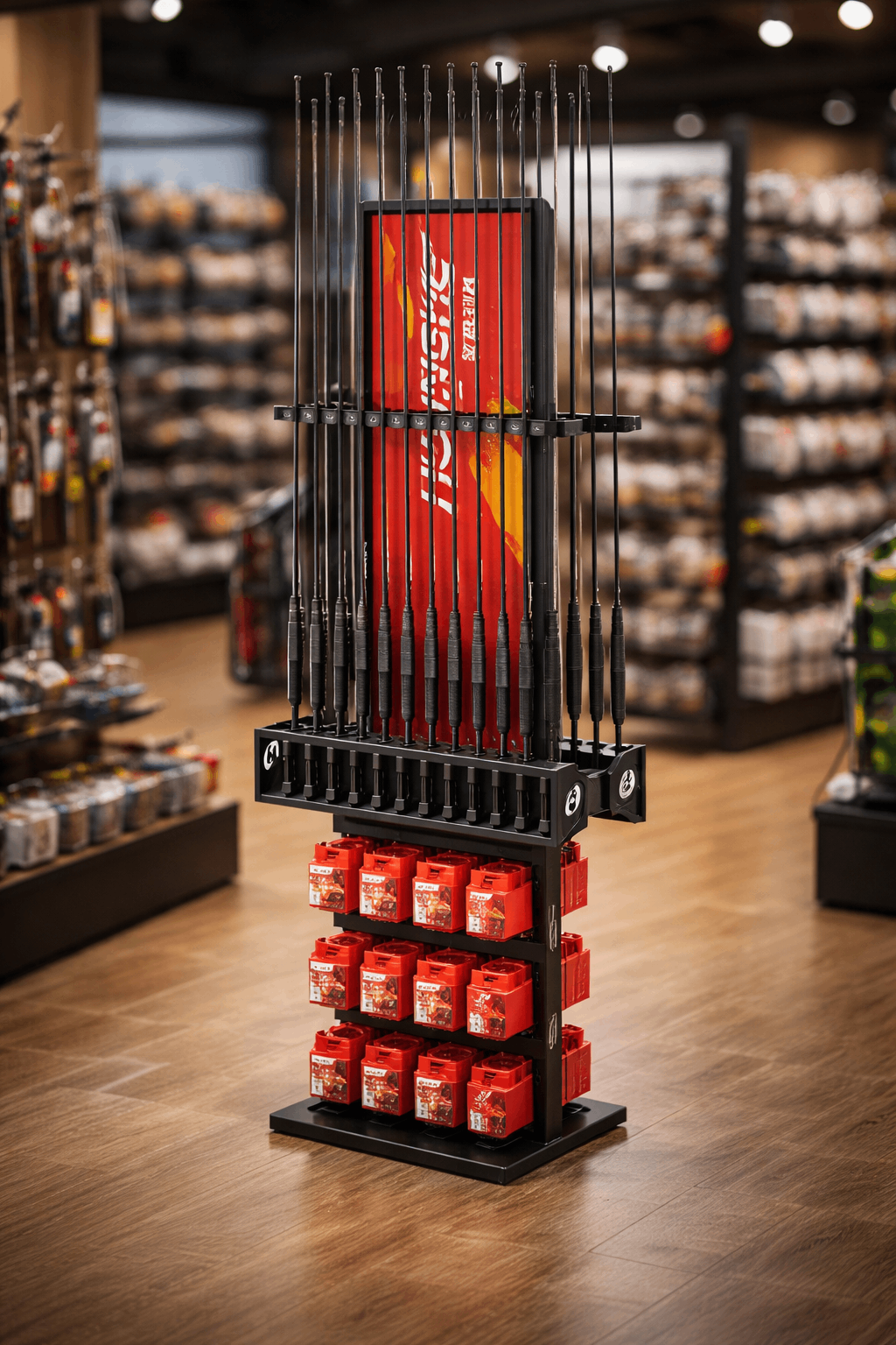Custom 2-Way Metal Fishing Rod Display for RetailersCustom 2-Way Metal Fishing Rod Display for Retailers