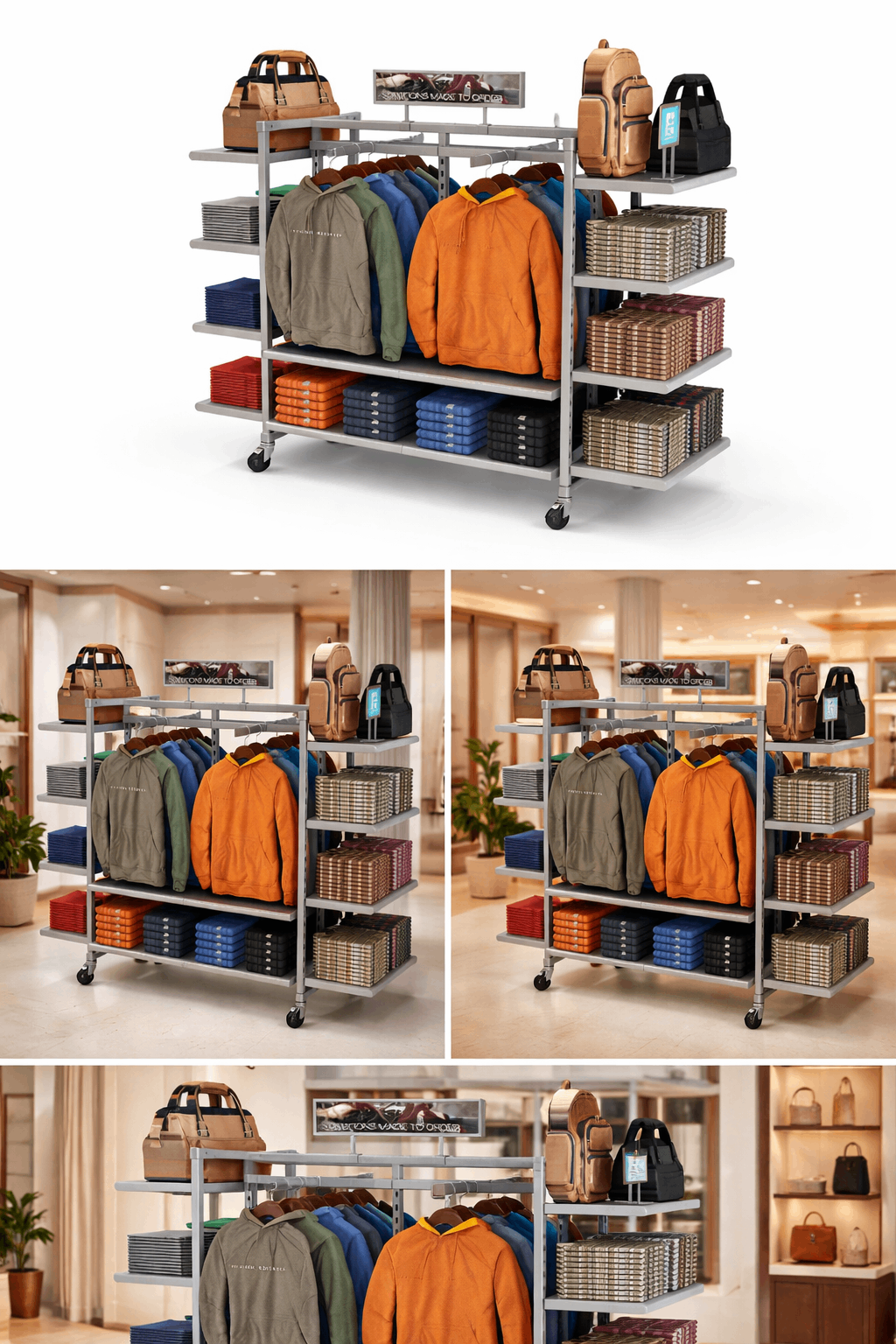 When retail buyers search for clothing display racks for stores, they are typically looking for fixtures that can support different merchandising layouts without requiring multiple display systems. A rack that combines hanging space, shelves, and mobility can simplify store planning for boutique retailers and apparel chains.