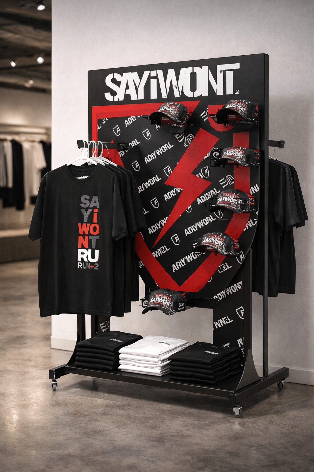 For wholesale buyers, the value of this fixture goes beyond holding clothing. It helps one product story read clearly in a commercial setting while still remaining practical for custom development and bulk execution. That story can include apparel, caps, and related branded accessories presented together around one visual campaign theme.