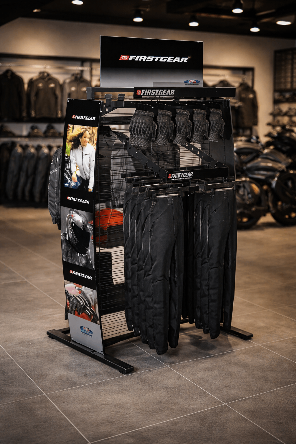 Motorcycle gear and technical apparel typically carry more weight than standard fashion garments. A steel display structure is better suited to this product category because it handles heavier jackets and trousers more confidently than lighter retail racks.
