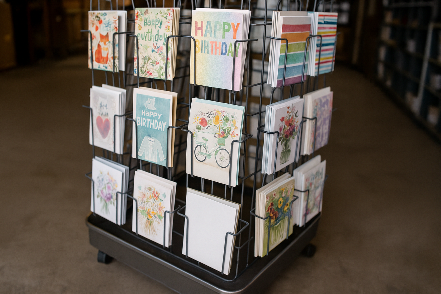 In greeting card and small-format merchandising, space efficiency is key. This 4-sided rack solves that with 72+ front-facing pockets for maximum SKU exposure. The rotating function allows shoppers to engage with all sides, improving sell-through and dwell time.