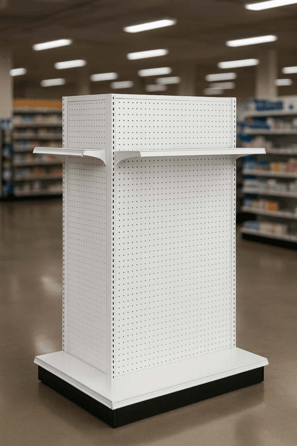 Each unit features tri-sided access, supporting dynamic layout configurations—from back-to-back aisle setups to central floor islands. It accommodates hooks, bins, shelves, and price holders, with white pegboard panels offering a clean and neutral merchandising background. The matte finish also enhances contrast for retail packaging and improves in-store clarity.