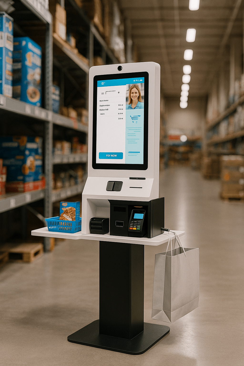 With SKU counts exceeding 5,000 in some outlets, traditional checkout counters become choke points. This kiosk accelerates transactions with integrated barcode scanning, self-bagging prompts, and instant receipt issuance.