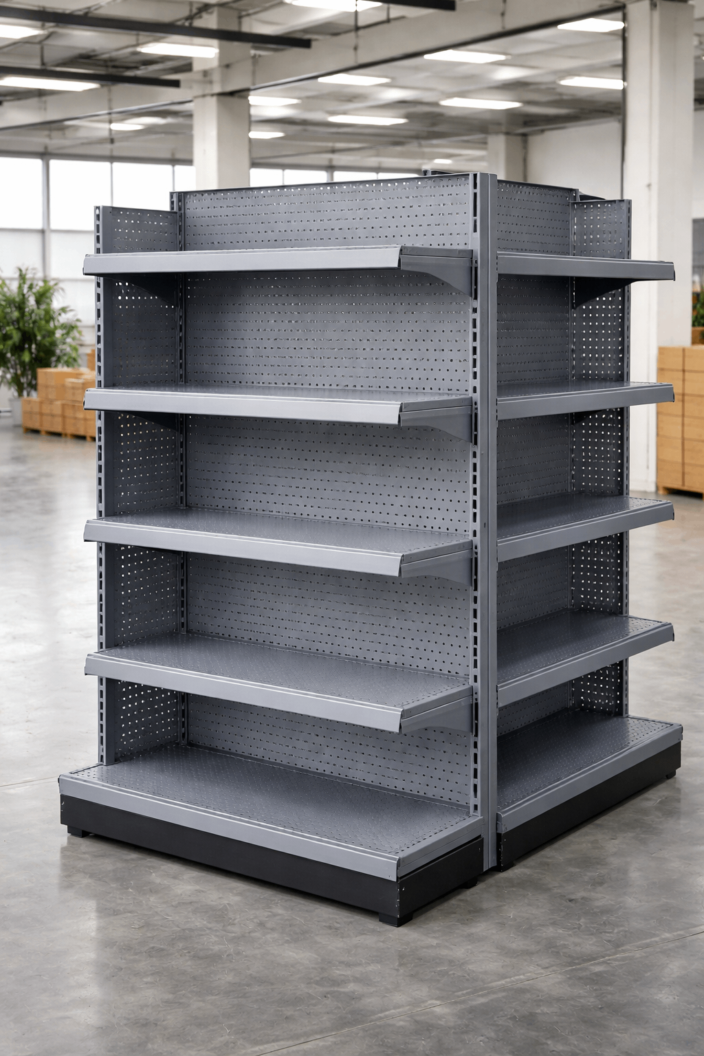The 4-layer pegboard gray metal wholesale gondola configuration is widely used in retail formats commonly supplied through wholesale channels. In supermarkets and grocery chains, it supports packaged foods, household items, and promotional displays that require stable support and clear visibility.